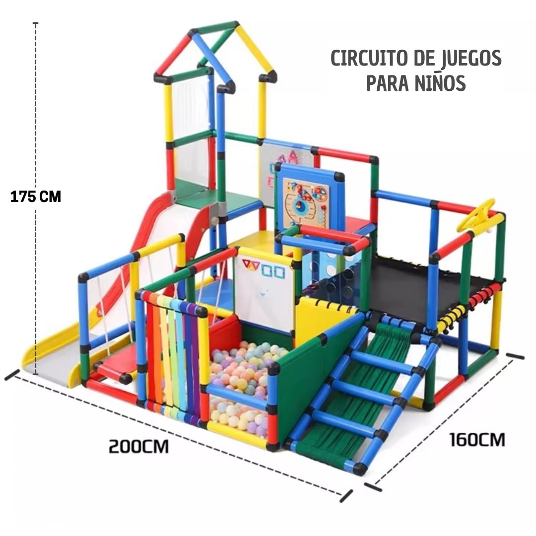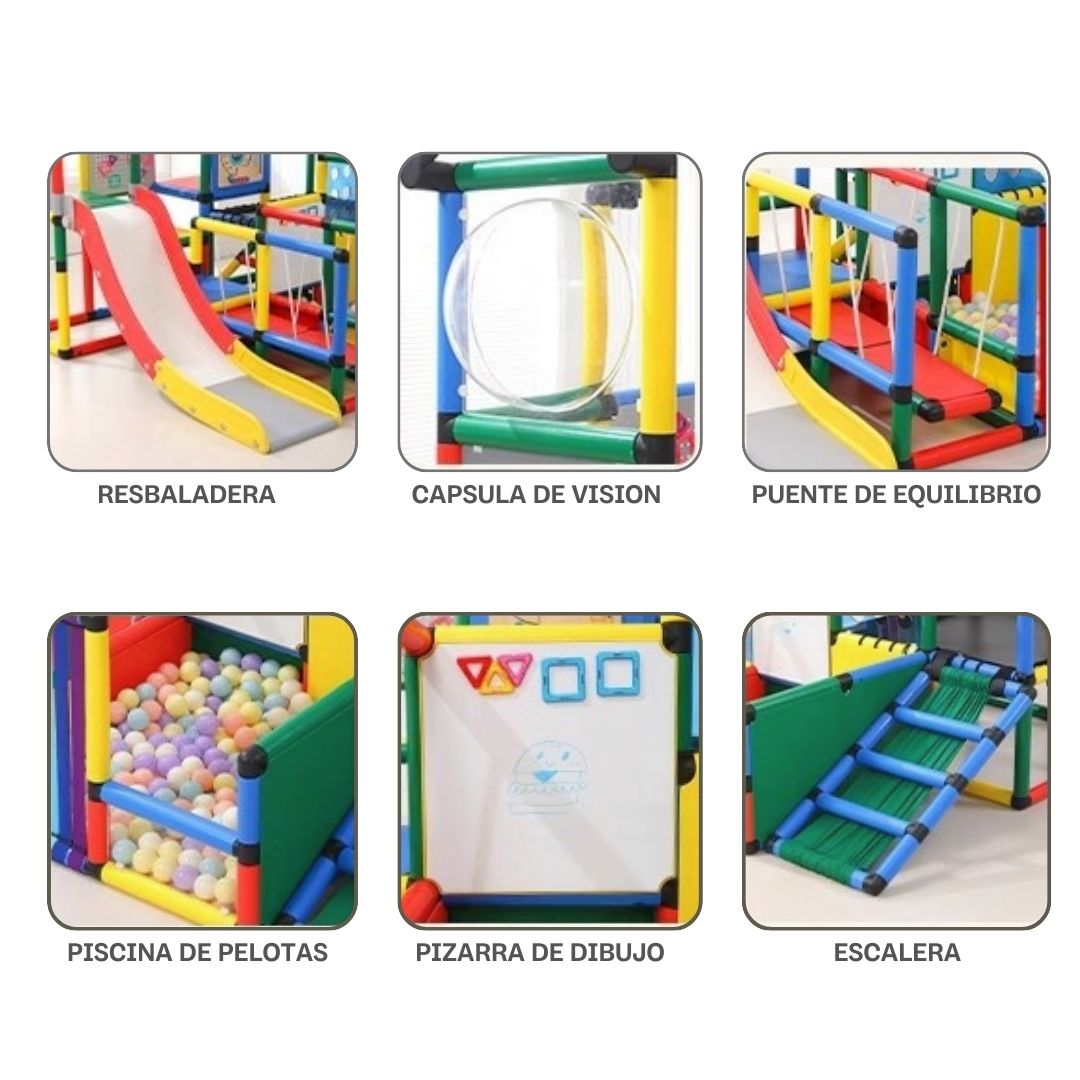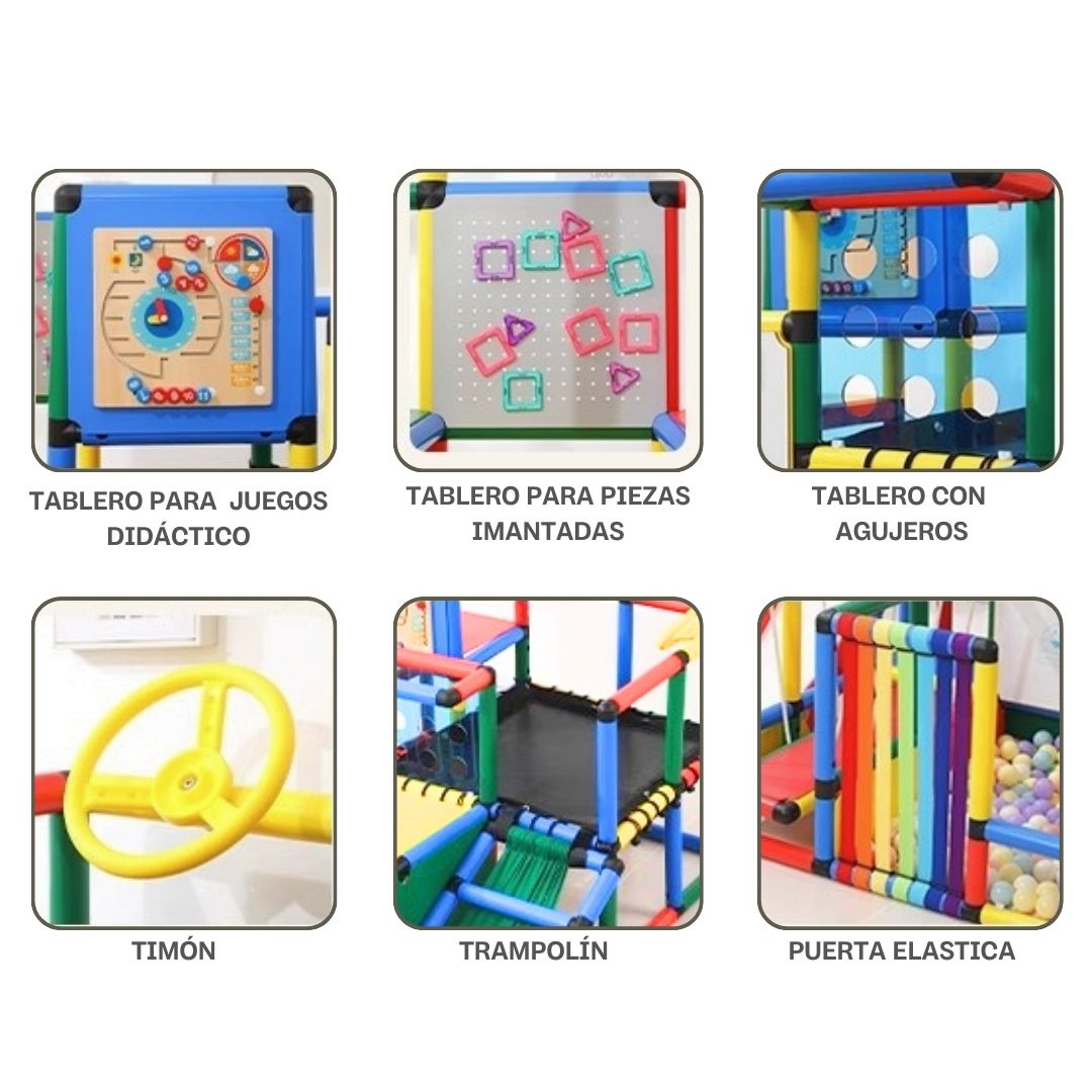 - DESCRIPCIÓN: Circuito de juego para niños Modelo MX-006 puede ser instalado en diferentes ambientes del interior del hogar. El circuito tiene diferentes formas de entretenimiento y aprendizaje. Tiene una piscina de pelotas, saltarín, puente colgante, resbaladera y tableros didácticos para juegos (Pizarra de dibujo, tablero imantado, tablero con agujeros redondos, tablero de juegos).
