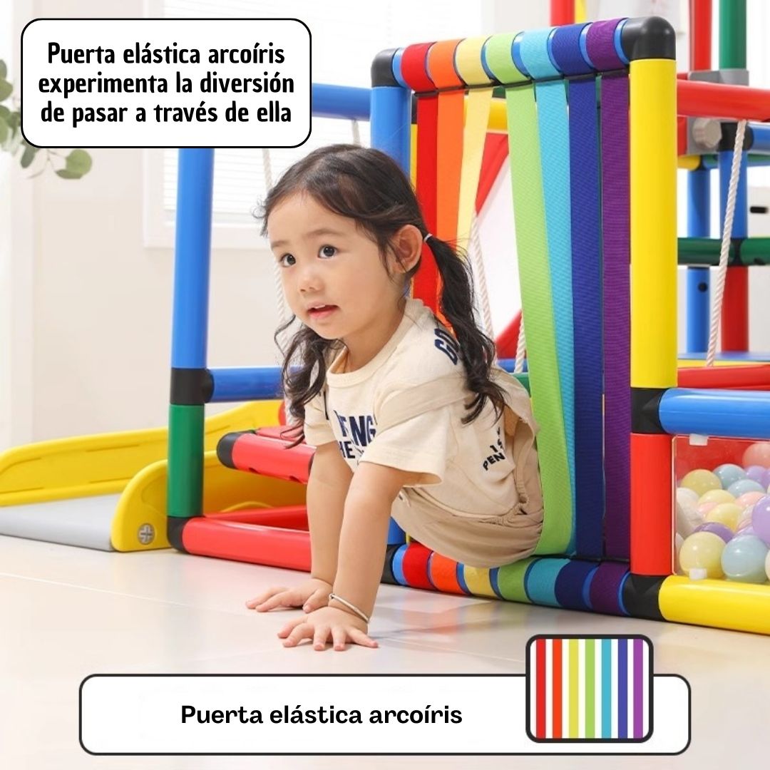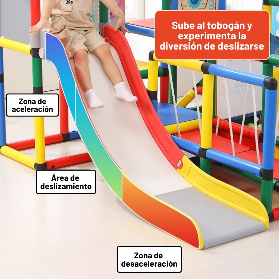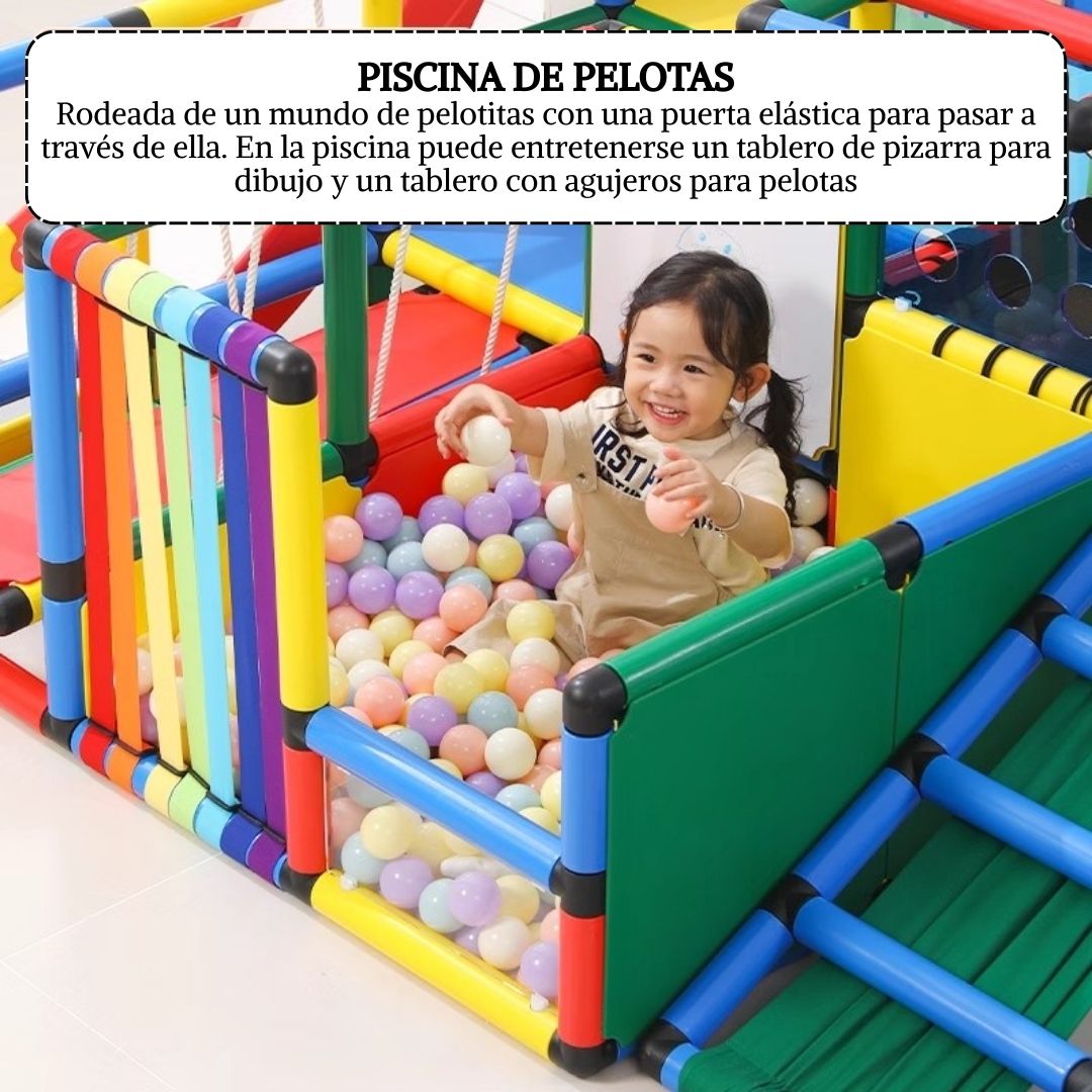 - DESCRIPCIÓN: Circuito de juego para niños Modelo MX-006 puede ser instalado en diferentes ambientes del interior del hogar. El circuito tiene diferentes formas de entretenimiento y aprendizaje. Tiene una piscina de pelotas, saltarín, puente colgante, resbaladera y tableros didácticos para juegos (Pizarra de dibujo, tablero imantado, tablero con agujeros redondos, tablero de juegos).