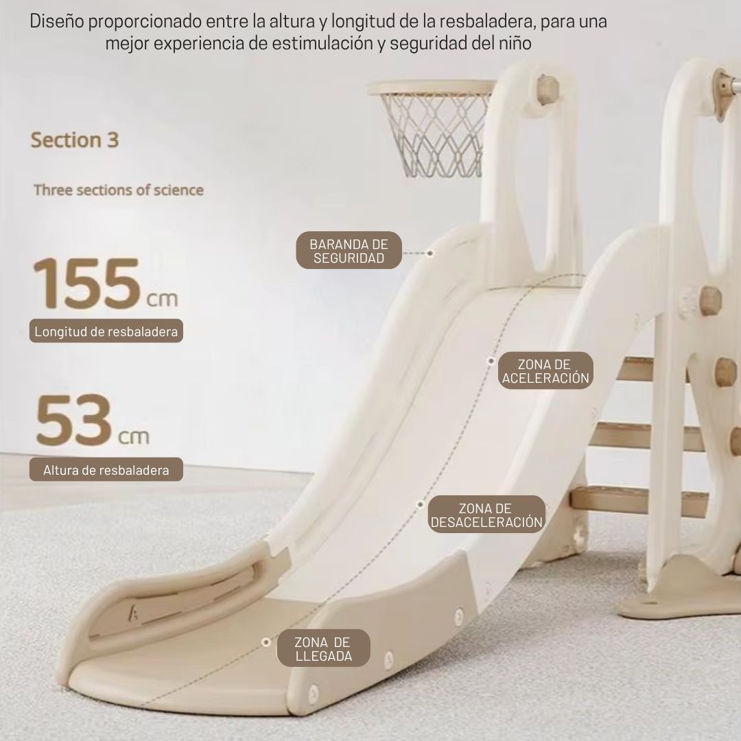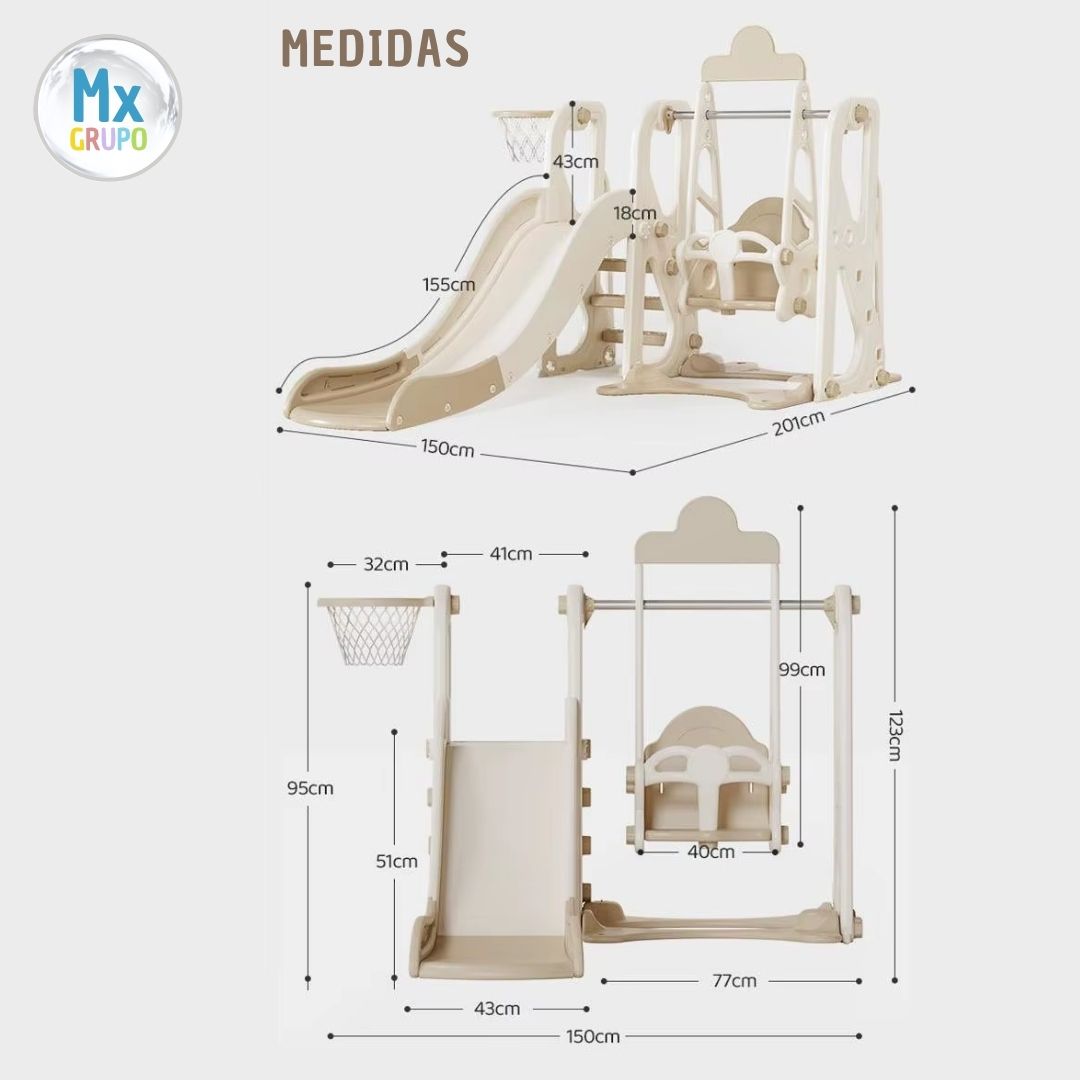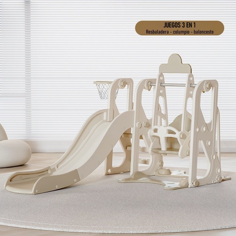 - DESCRIPCIĂN: Juegos de diversiĂłn 3 en 1 beige, tiene incorporado un columpio, una resbaladera con escaleras antideslizante y un aro para juego de baloncesto. Diseño de calidad superior.